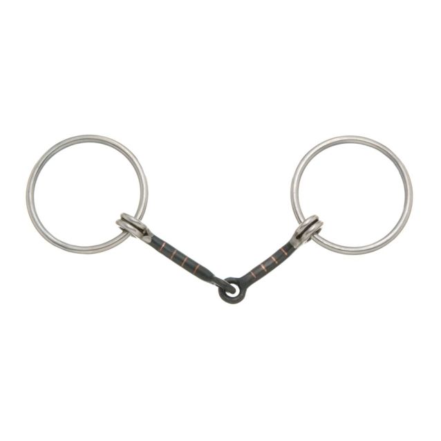 Este filete de una sola articulación está hecho de acero inoxidable de calidad con anillas sueltas. La boquilla de hierro dulce presenta rayas de cobre incrustadas para promover la salivación y ofrecer al caballo un sabor más dulce en general. (Nota: el hierro dulce está diseñado para oxidarse)