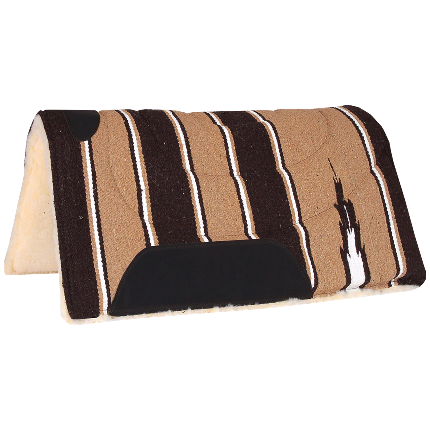 Parte superior de manta Navajo con centro de fieltro grueso de una pulgada, parte inferior de vellón de maíz y cueros de desgaste negros.