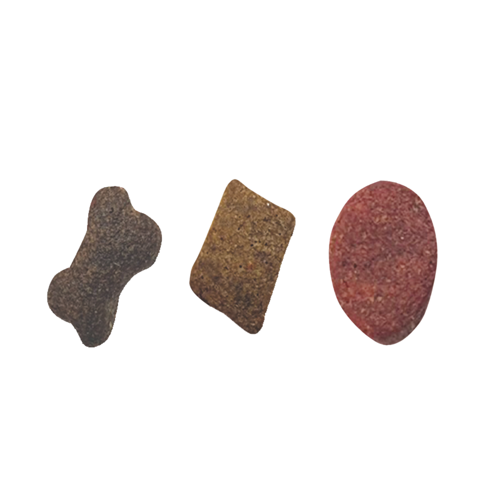 Cereales y sus derivados y/o mandioca, harina de carne de pollo y/o cerdo, soya y sus derivados, grasa de pollo y/o cerdo, pulpa de remolacha deshidratada, saborizante natural (hidrolizado de subproductos de pollo y/o cerdo), Yucca schidigera, inulina, cloruro de sodio, aminoácidos (lisina y metionina), zeolita y/o bentonita, levadura seca de cervecería inactiva con selenio (fuente de betaglucanos y selenio), antioxidantes (BHA/BHT), minerales, vitaminas y pigmentos.