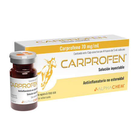 Precio normal $ 4,838.40Precio unitario /AgotadoMuy poca disponibilidad (3 unidades)CARPROFEN (CARPROFENO 70 mg/ml) CAJA CON 4 FRASCOS DE 5 ML