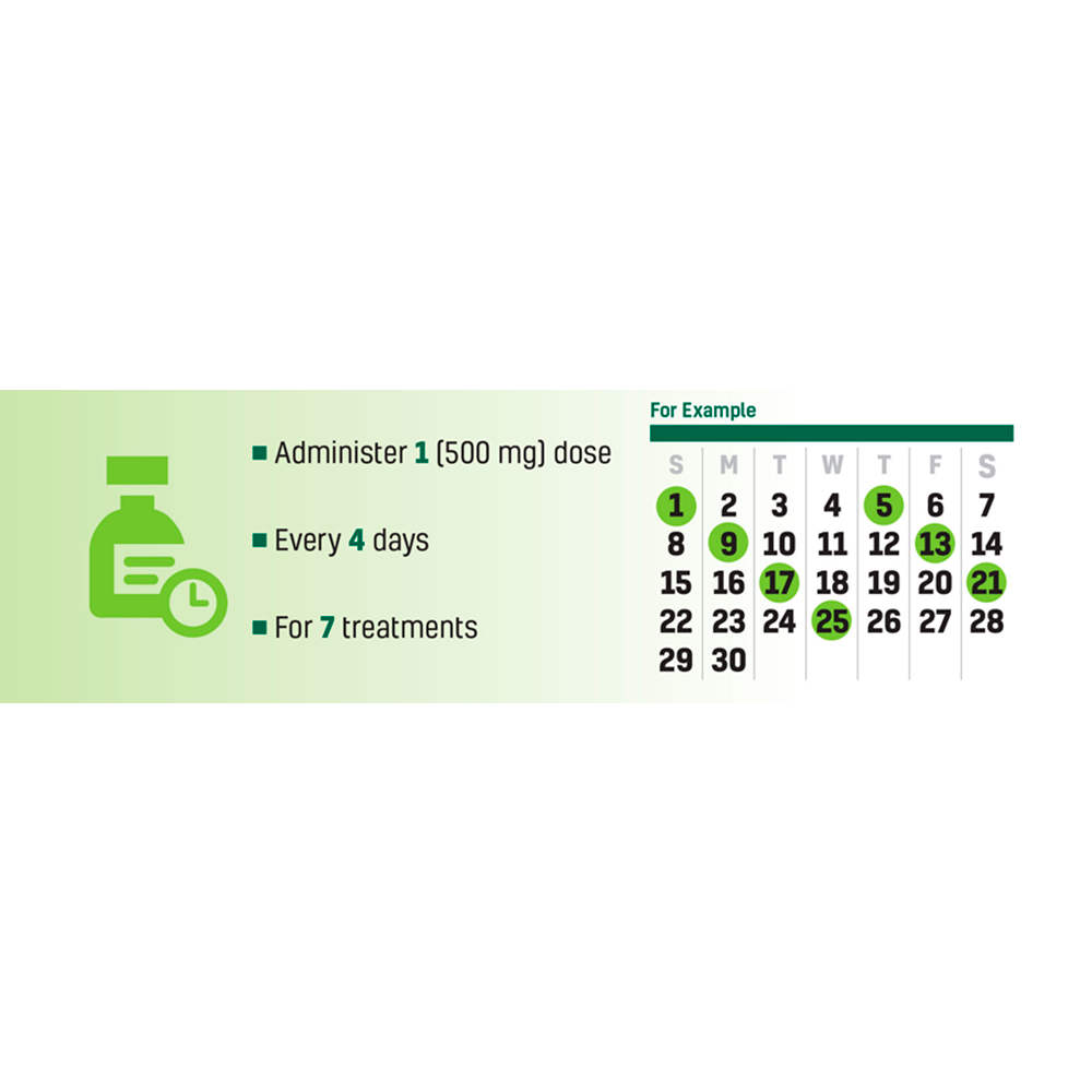 Después del primer tratamiento, usted y su veterinario deben continuar vigilando la salud y la movilidad de las articulaciones de su caballo. Su veterinario puede recomendar repetir el horario que se muestra según sea necesario si los signos de artritis regresan.