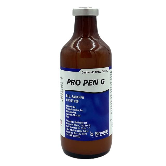 La penicilina G procaína es un método alternativo en suspensión inyectable. Cada ml de Pro-Pen-G contiene 300,000 UI de penicilina G potásica y 130.8 mg de hidrocloruro de procaína más diversos ingredientes inertes. Agua destilada c. b. p. 1 ml. La penicilina G potásica y el hidrocloruro de procaína reaccionan para formar la penicilina G procaína.