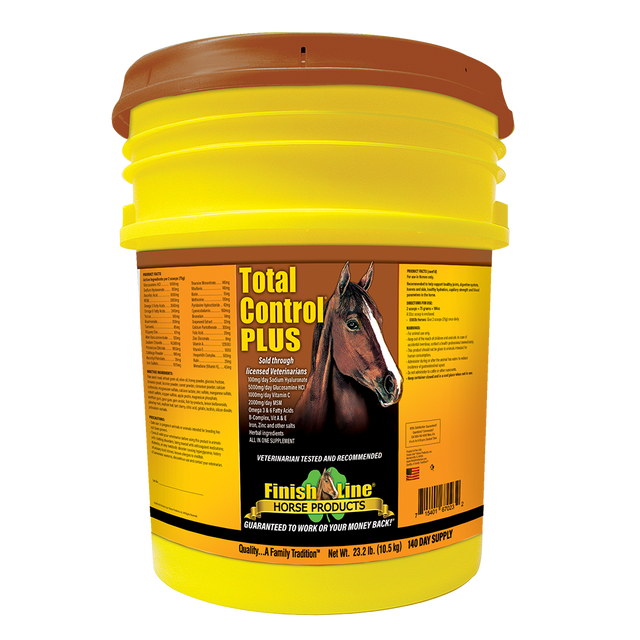 TOTAL CONTROL PLUS es un suplemento todo en uno diseñado pensando en el rendimiento y el caballo de carreras. Proporciona seis suplementos cruciales en una dosis diaria. Esta fórmula con todo incluido fomenta una digestión saludable, una absorción óptima de nutrientes y tiene todo lo que un caballo de rendimiento necesita para mantenerse saludable. Está formulado para combinar los ingredientes activos de seis productos para caballos Finish Line aprobados por veterinarios: Apple-A-Day , U-7 Gastric Aid, Fluid Action HA, Feet First Coat 2nd, Iron Power Y XBL Ultra - todo en un suplemento diario apetecible.