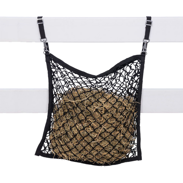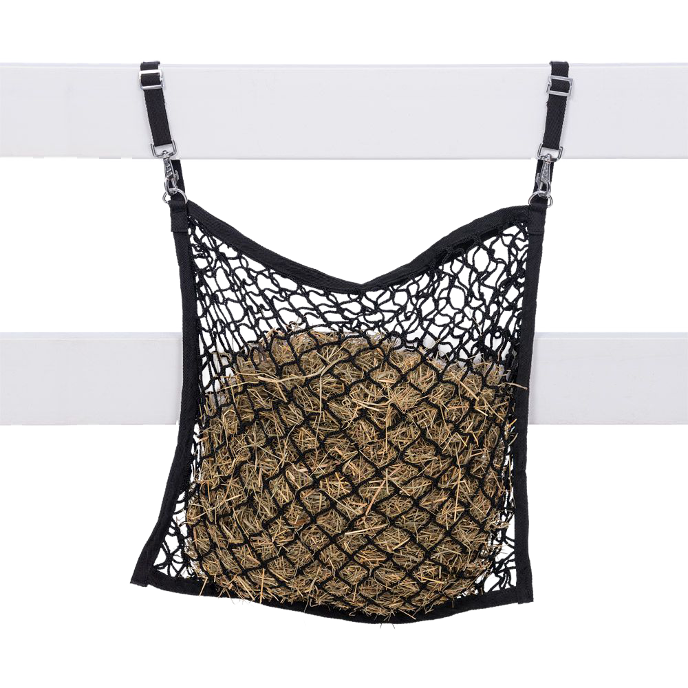Red de alimentación para colgar en cercas o paneles, diseñada específicamente para mini caballos o ponis. Fabricada con poliéster (poly) de alta durabilidad y tejido a máquina que evita que se deforme con el uso. Sus aberturas de 1½″ x 1½″ permiten una alimentación lenta y más natural, manteniendo a los animales entretenidos y reduciendo su ingesta apresurada. Es apta para múltiples animales y ayuda a prevenir conductas como comer con hambre o aburrimiento.