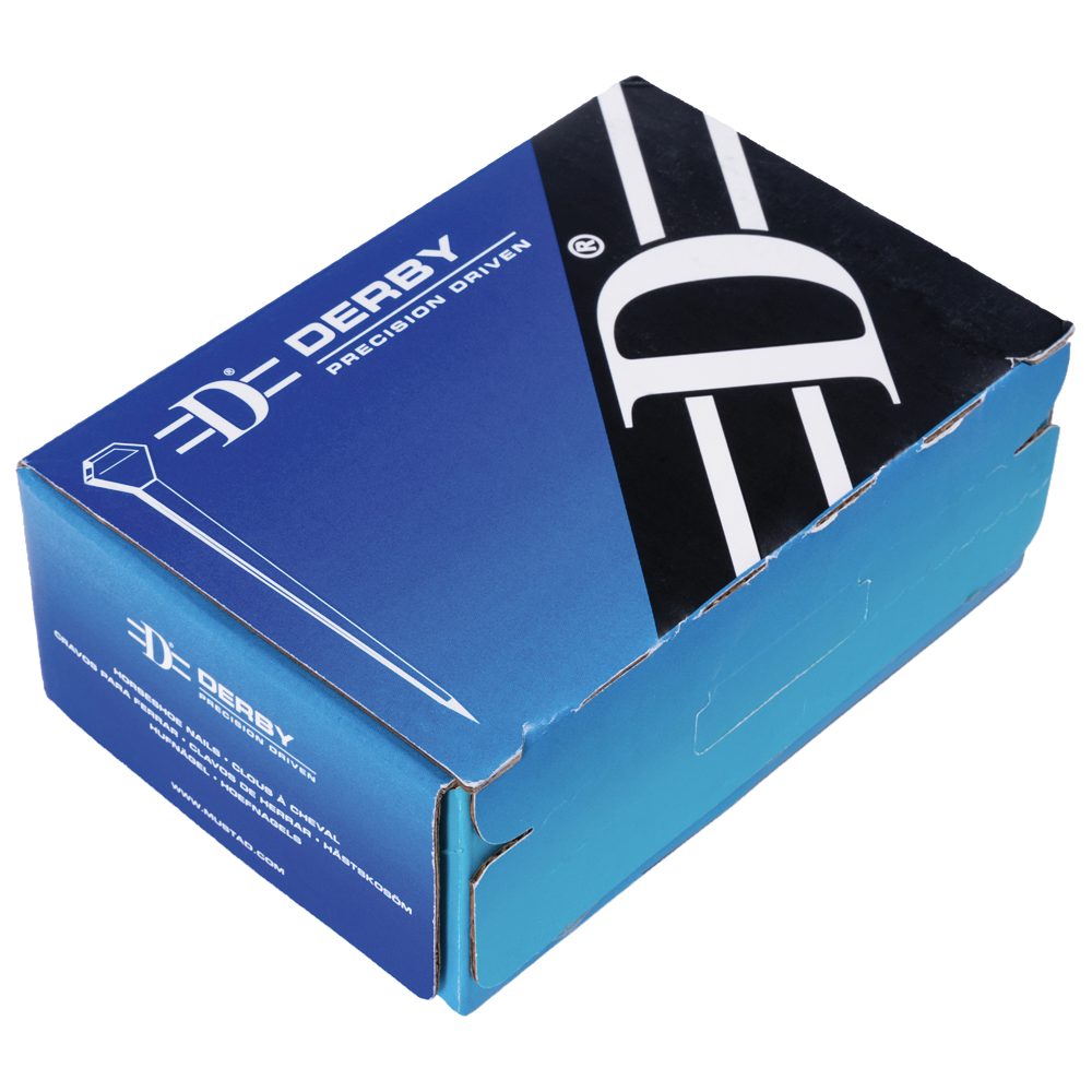 Los clavos Derby son el resultado de 30 años de constante esfuerzo y perfeccionamiento para elaborar un producto con todas las características de calidad que requiere el mercado. La demanda del clavo de carreras Derby en todo el mundo es prueba de su eficiencia, calidad y fiabilidad. 'Calidad: lo que cuenta son los detalles'