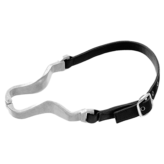 Diseñado para ayudar a reducir el comportamiento de tragar aire de los caballos. Este collar está fabricado con una resistente correa de nailon doblada y cosida con ajuste de hebilla de acero duradero. Cinco orificios para ajustar el tamaño están reforzados con ojales metálicos para mayor durabilidad. Bisagra de aluminio.