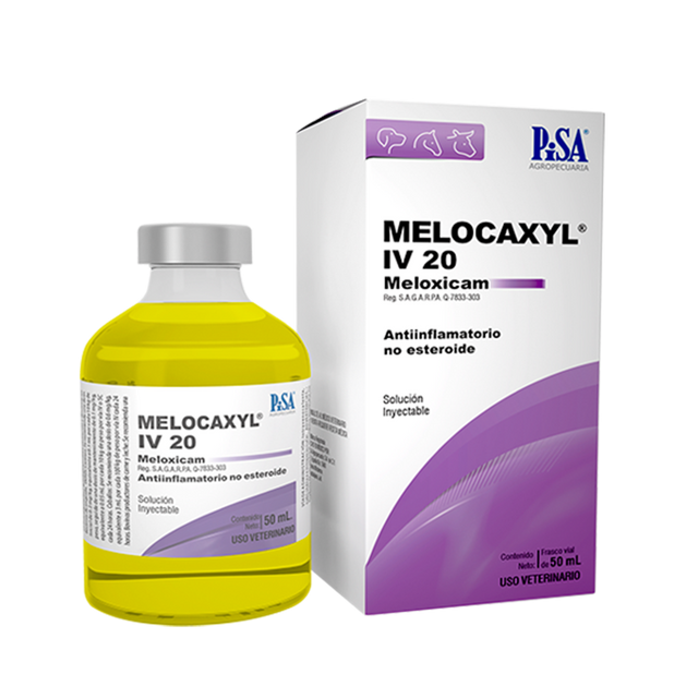 MELOCAXYL® IV 20 es una solución inyectable a base de meloxicam un antiinflamatorio no esteroide AINE con efecto analgésico, antiinflamatorio y antipirético para su uso en caninos, bovinos productores de carne y leche, y equinos.