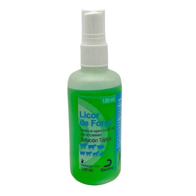 Limpiar la zona afectada y aplique la cantidad necesaria de Licor de Forge para humedecer la herida o el área lastimada. Cada 24 horas de 5 a 7 días o a criterio del Médico Veterinario