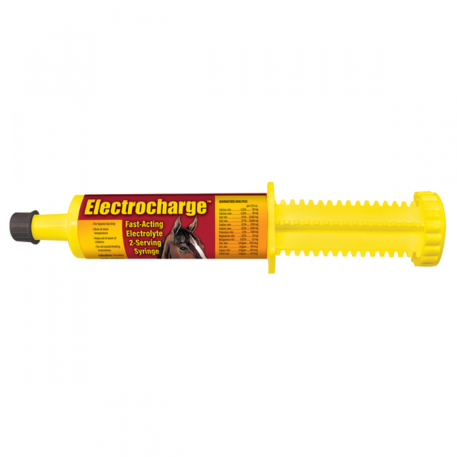 Electrocharge™ es una mezcla de pasta oral de rápida absorción de electrolitos y sales minerales traza que ayudan a promover una hidratación saludable en su caballo. Todo esto en una cómoda jeringa de 2 dosis.
