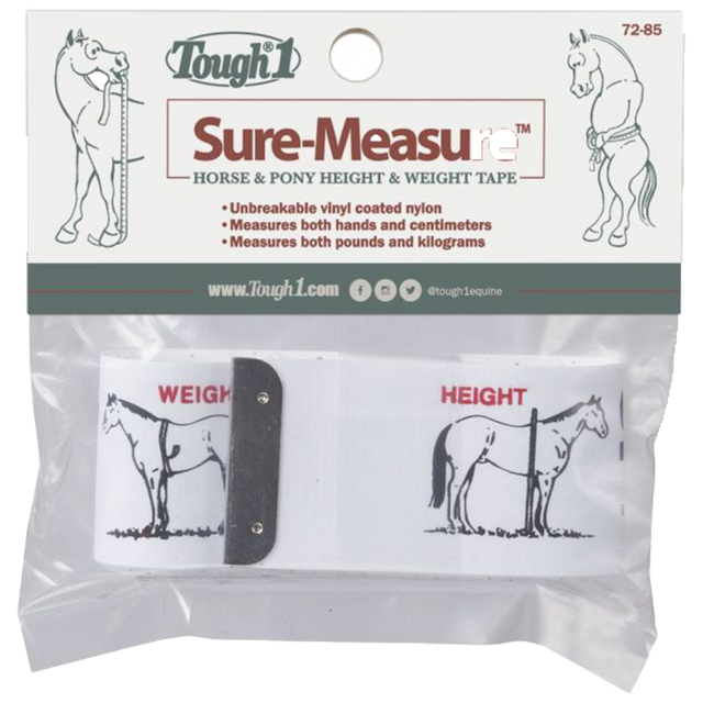 Fabricado en nailon ancho e irrompible recubierto de vinilo. Un lado está diseñado para estimar el peso del caballo tanto en libras como en kilogramos. El reverso mide la altura del caballo en manos y centímetros. Esto también sirve como una guía de acondicionamiento diario rápida y eficiente con pestañas "Quick Grip" para enrollar y almacenar fácilmente.