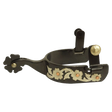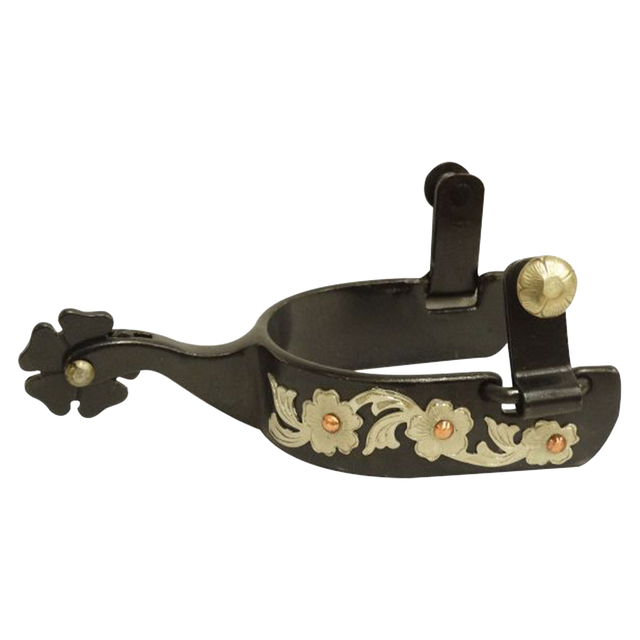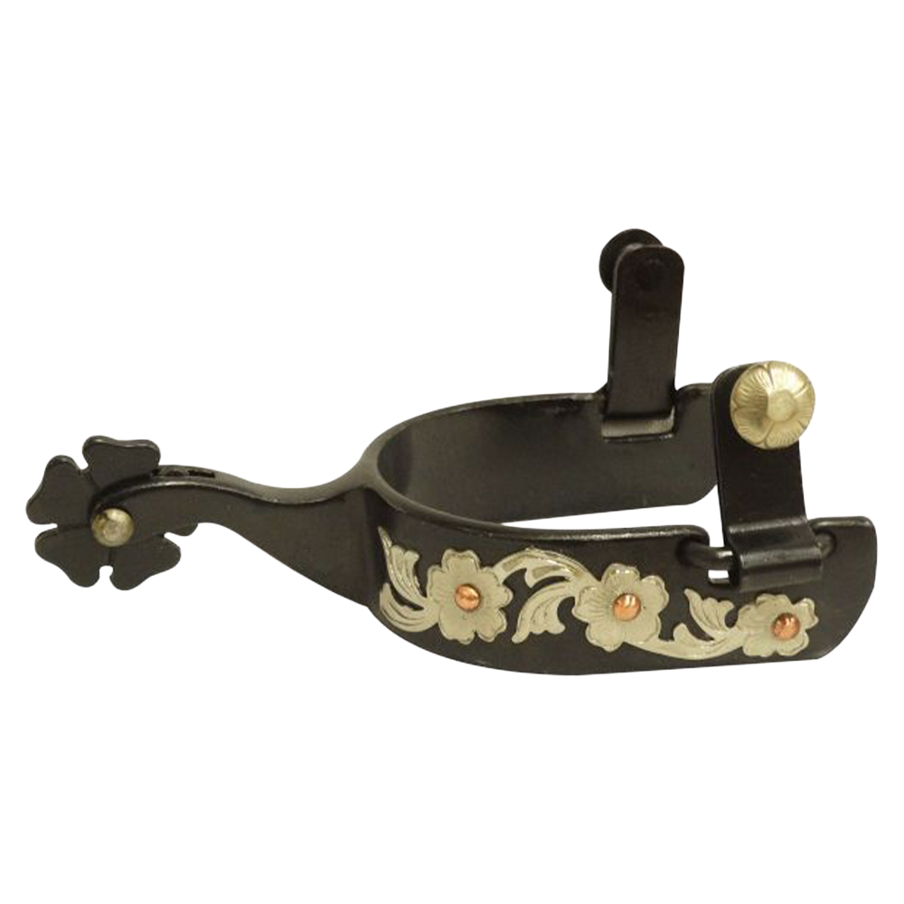 Esta espuela para mujer ofrece un diseño elegante y funcional, ideal para jinetas que buscan destacar con estilo. Fabricado en acero negro resistente, cuenta con un grabado plateado en relieve y remaches de cobre, reflejando un acabado atractivo y profesional, adecuado para montas de exhibición o uso diario.