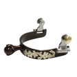 Espuelas de acero con acabado marrón antiguo (antique brown) para damas, decoradas con elegantes grabados en plata. El diseño incluye un rodillo giratorio (roller ball) para una señal más suave y sutil. Estilo elegante que combina estética refinada con funcionalidad.