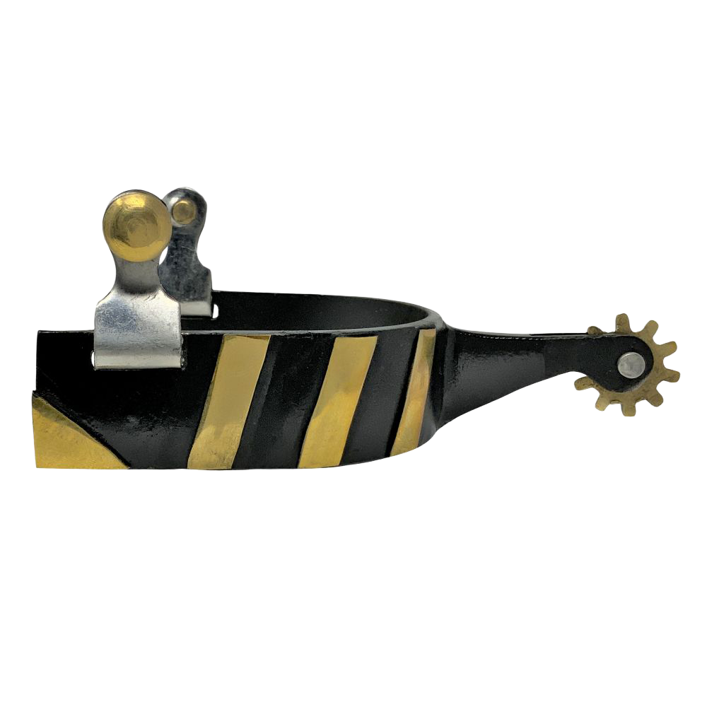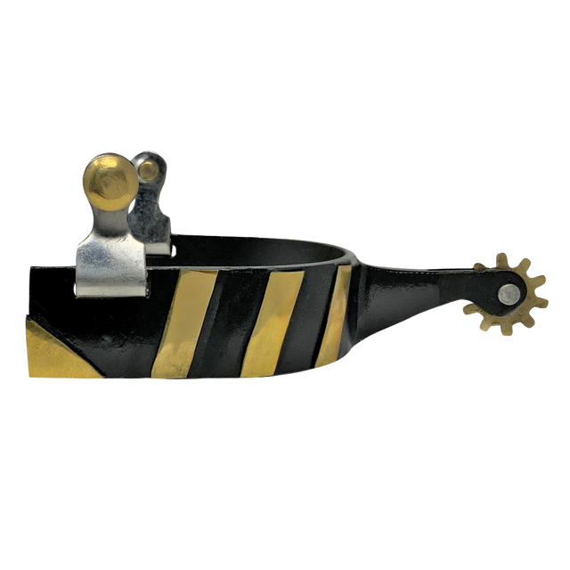 Espuelas duraderas en acero negro ideales para uso western. Están adornadas con una barra frontal de latón y cuentan con botones y rodelas también bañadas en latón. Proporcionan una combinación estética atractiva y funcionalidad robusta para el jinete demandante.