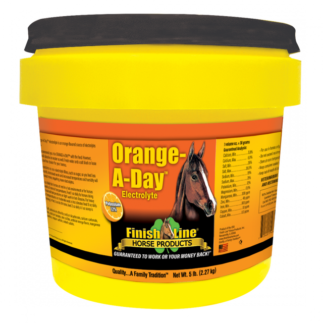 Para caballos que prefieren el sabor a naranja. Los electrolitos y oligoelementos Orange-A-Day de Finish Line® ayudan a promover una hidratación saludable en su caballo al reemplazar los electrolitos perdidos durante la actividad diaria. Este reemplazo de electrolitos / minerales repone los electrolitos y ayuda en el apetito y el consumo de agua. Orange-A-Day ™ es un producto rentable que no contiene rellenos, azúcares ni colorantes artificiales.
