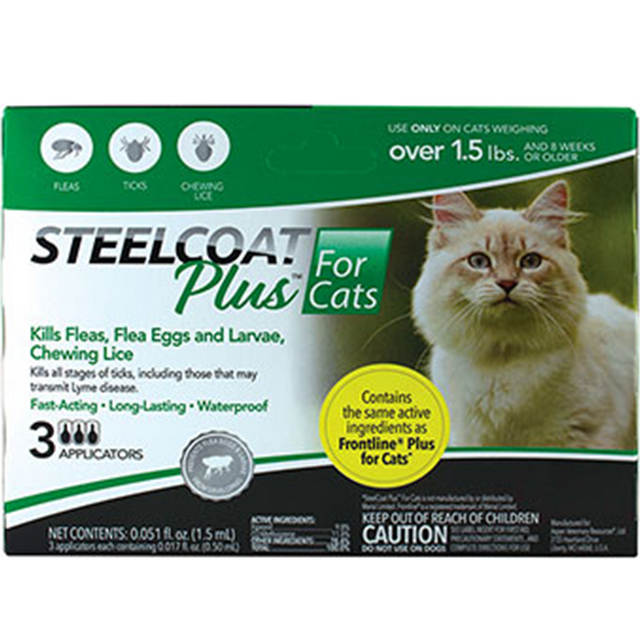 Una solución tópica de calidad veterinaria que protege a sus gatos de pulgas y garrapatas. SteelCoat® Plus para gatos contiene los mismos ingredientes activos (fipronil + (S)-metopreno) que la marca líder, FRONTLINE® Plus para gatos*, lo que evita que se desarrollen todas las etapas de las pulgas, incluidas las pulgas adultas, los huevos de pulgas y las larvas. Este tratamiento a prueba de agua mata todas las etapas de las garrapatas, elimina los piojos masticadores y ayuda a controlar las infestaciones de ácaros de la sarna. Para uso únicamente en gatos de 8 semanas o más y que pesen más de 670 gramos.