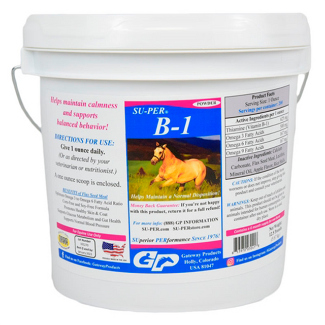 Otro beneficio principal de la tiamina es su efecto calmante. La tiamina es responsable de enviar los impulsos nerviosos por todo el cuerpo, por lo tanto, una deficiencia de tiamina puede hacer que los caballos estén irritables, nerviosos, ansiosos, desenfocados o difíciles de trabajar. Dada la mayor necesidad de tiamina en el caballo de rendimiento, muchos problemas de comportamiento que parecen "aparecer y desaparecer" con el caballo pueden estar relacionados con una deficiencia de B-1.