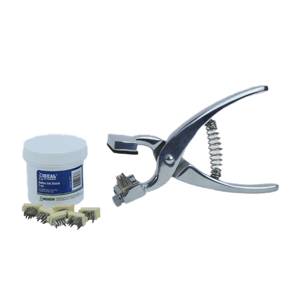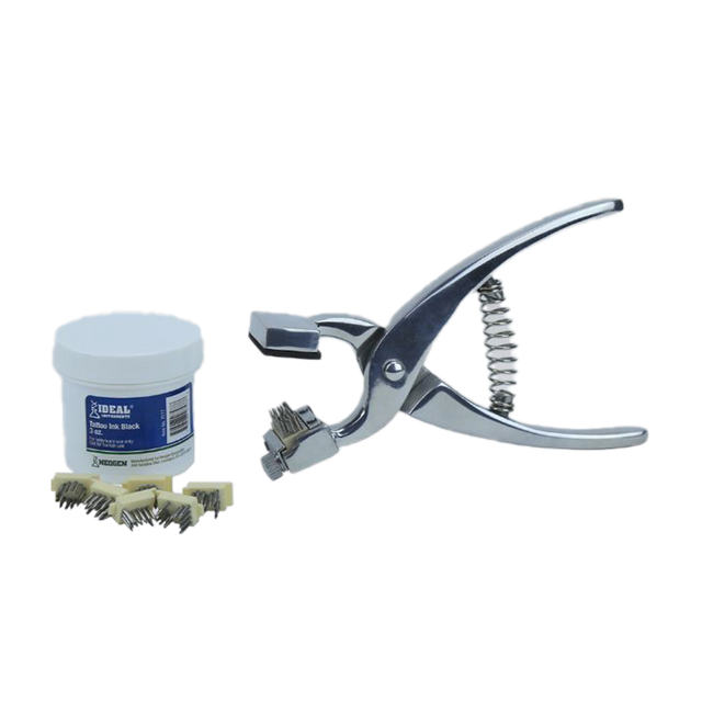Los kits de tatuaje Ideal® son instrumentos versátiles y económicos con una construcción resistente que se utilizan para la identificación permanente de animales. Los alicates grandes sostienen cuatro letras o dígitos de 3/8". Los alicates pequeños sostienen cinco dígitos de 5/16". Alicates de aleación de aluminio.