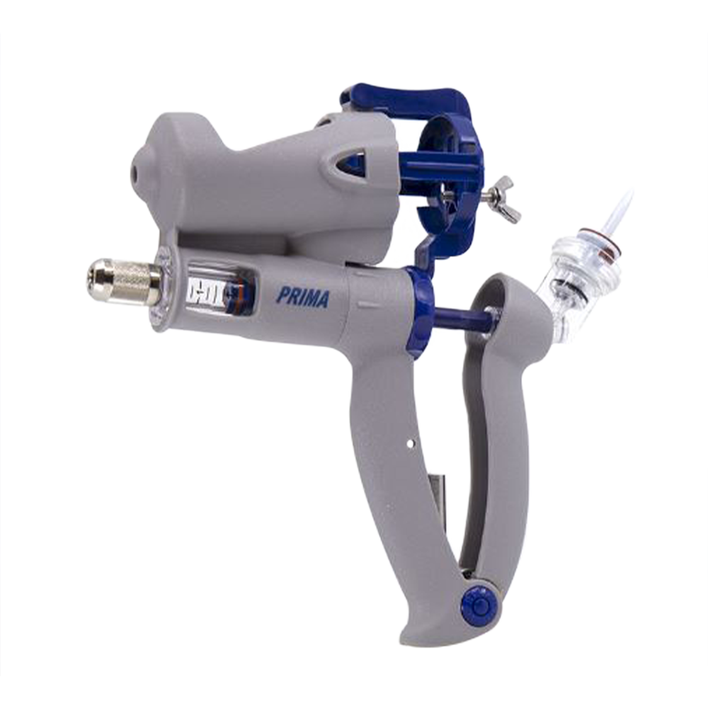 El vacunador Prima Marc™ inyecta y marca simultáneamente al animal con un solo movimiento de la mano. Cuando se administra la dosis, al apretar la jeringa se activa la lata de aerosol, que libera una marca de pintura sobre el animal. Esto fomenta prácticas de administración seguras, mejora los esfuerzos de control de calidad y ahorra el costo de los animales perdidos. Empaquetado con Fast Fit de 100 ml/20 mm, Fast Fit de 250 ml/30 mm, tres collares de botella (20 mm, 30 mm, 33 mm), tuerca de seguridad luer de metal y paquete de lubricante.