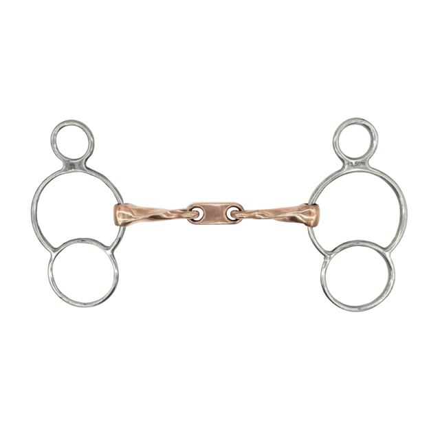 El Twisted Copper Two Ring con Dr. Bristol Link Bit combina una embocadura de cobre torsionado para una comunicación más precisa con un enlace Dr. Bristol que distribuye la presión de manera uniforme. El diseño de dos anillas (Two Ring) ofrece múltiples opciones de colocación de riendas, permitiendo a los jinetes ajustar el nivel de palanca y respuesta según las necesidades del caballo.