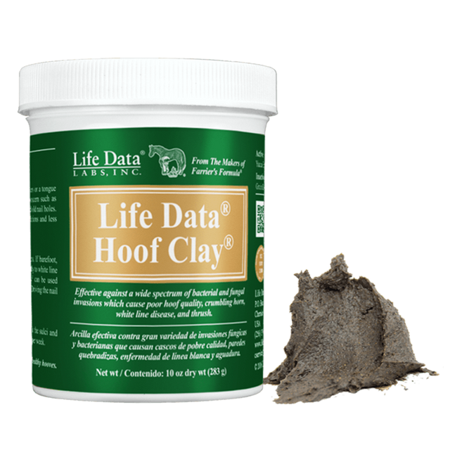 Life Data® Hoof Clay® es una arcilla antimicrobiana flexible que fácilmente se adhiere y mantiene en los defectos, rajaduras, grietas y hoyos viejos de clavos en los cascos. Life Data® Hoof Clay® suministra protección continua contra una gran variedad de invasiones fúngicas y bacterianas que conducen a cascos de pobre calidad, separaciones de la muralla, paredes quebradizas, enfermedad de línea blanca y aguadura. Life Data® Hoof Clay® no irrita y puede ser aplicada sin utilizar guantes.