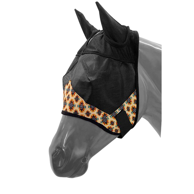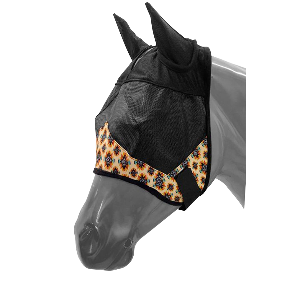 Máscara contra moscas del tamaño de un caballo con detalles en estampado azteca Showman ® y orejas. La máscara contra moscas está hecha de fibra natural y presenta una abertura en la nuca del caballo para el mechón y un cierre de velcro alrededor de la mejilla. Fabricado por productos Showman®.