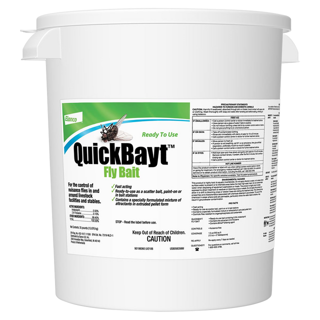 QuickBayt® Fly Bait es un gránulo listo para usar a base de azúcar que contiene el insecticida neonicotinoide de acción rápida, imidacloprid. El imidacloprid es una neurotoxina para insectos que mata eficazmente a la mosca doméstica adulta (Musca domestica) y a la mosca doméstica menor (Fannia canicularis), incluidas las cepas resistentes a los organofosforados.