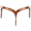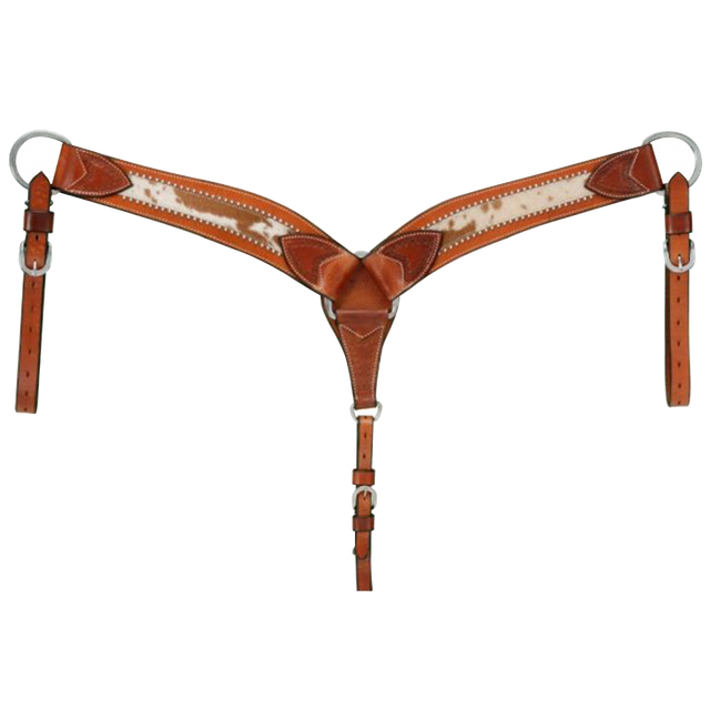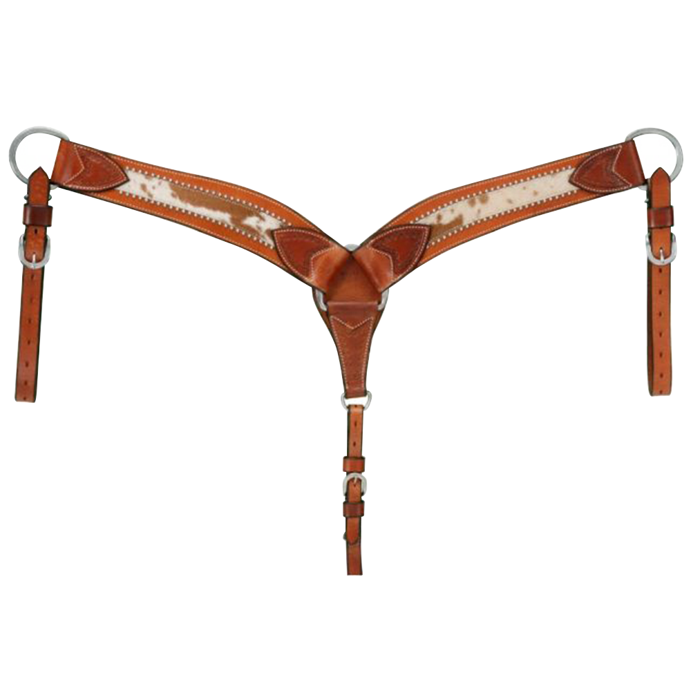 Elegante peto occidental hecho de cuero de calidad con capa de pelo manchada y detalles de puntos plateados. El corte contorneado está diseñado para abrazar cómodamente los hombros. Completo con cincha ajustable y correas de tiro. Herrajes de acero inoxidable.