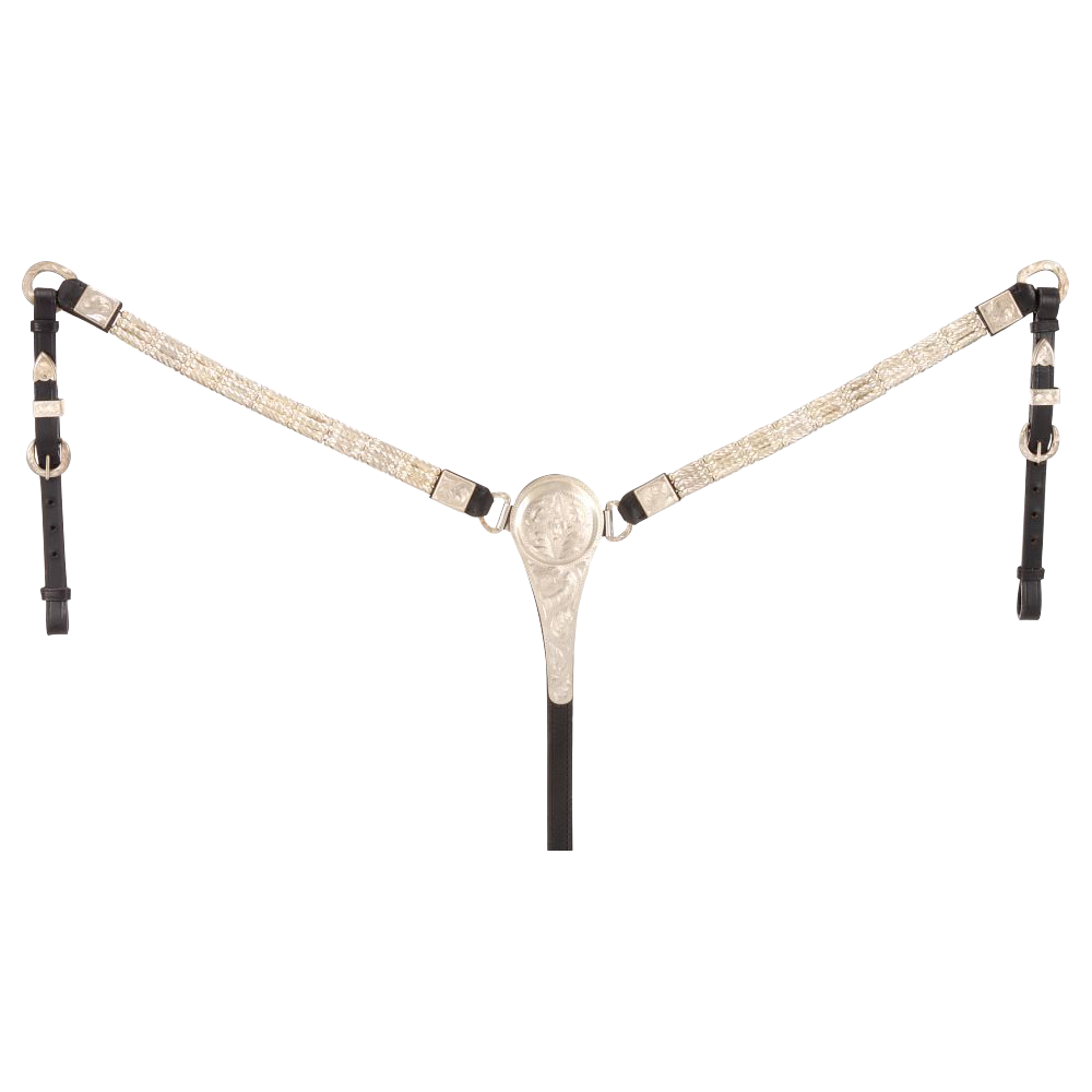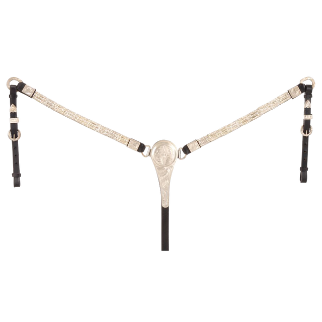 Esta pechera de espectáculo está confeccionado en fina piel de brida y elegantemente realzado con virolas plateadas grabadas. Ya sea en conjunto o solo, ¡este peto seguramente llamará la atención!