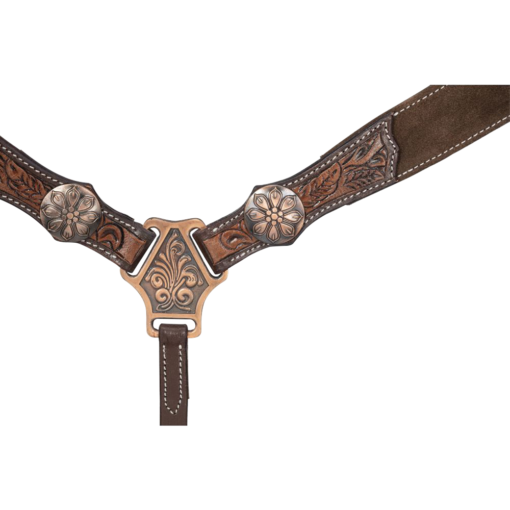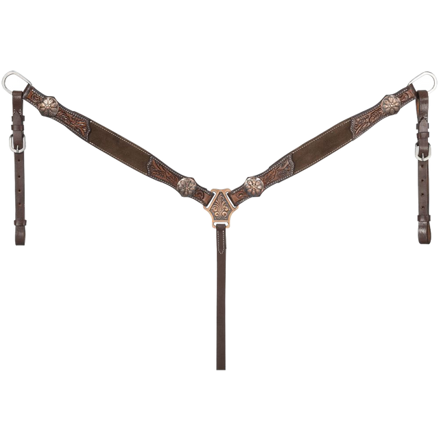 El peto Laramie presenta una construcción de cuero de gamuza de calidad con hermosos detalles de hojas. Hermosos conchos y plato central de cobre ofrecen un toque final elegante. Incluye correas de longitud ajustable y herrajes de acero inoxidable.