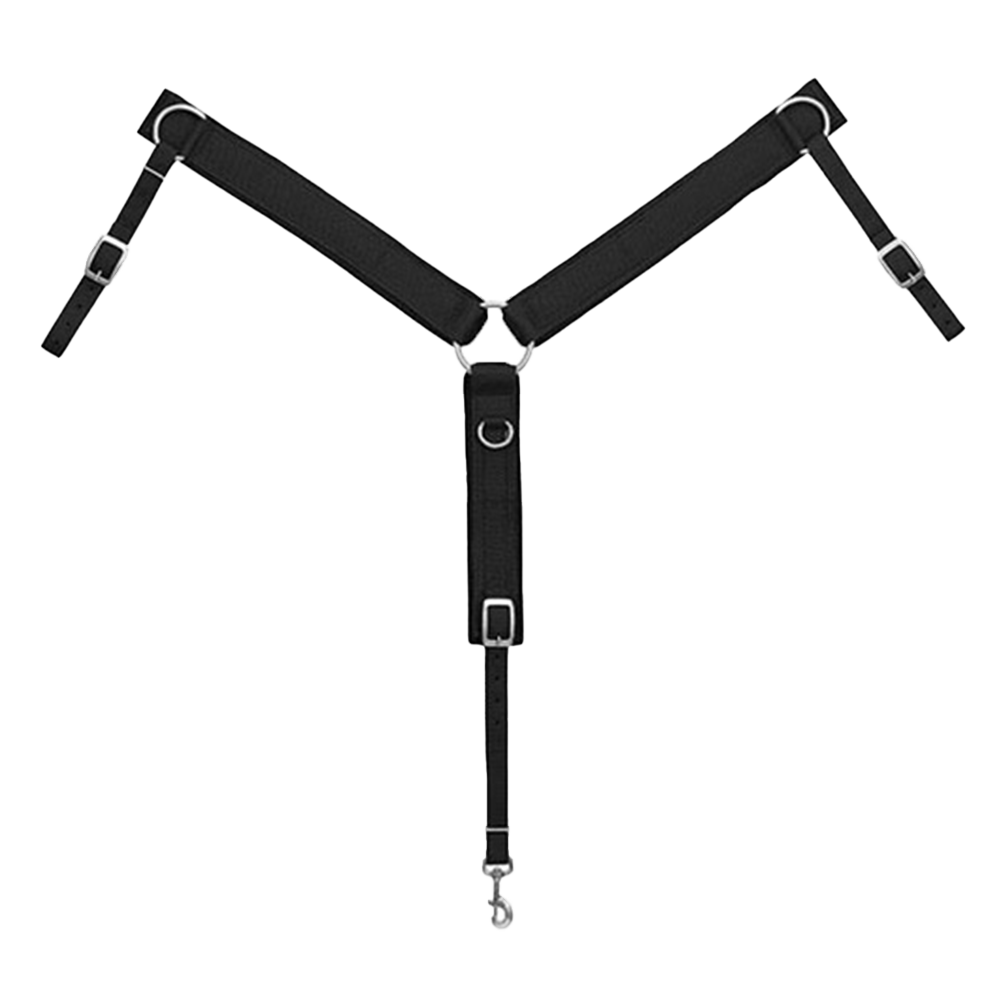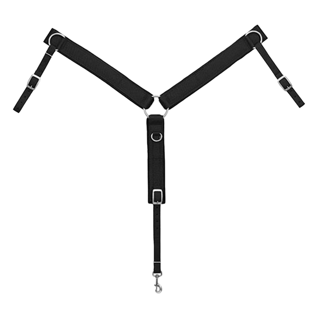 Este collar de pecho está forrado con fieltro 100% negro de 1/2" de grosor en las piezas del pecho y la correa central para mayor comodidad. Cuenta con una hebilla para atar y un broche para sujetar la cincha. Herrajes duraderos niquelados (excepto el anillo central no -acero inoxidable oxidado) Tamaño caballo.