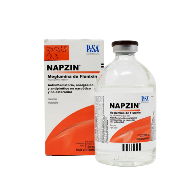 NAPZIN es un fármaco inyectable con acción analgésica, antiinflamatoria, y antipirética no esteroide que se indica en el tratamiento de endotoxemias y auxiliar en el tratamiento de enfermedades respiratorias, así como desordenes de los músculos esquelético y liso (traumatismos musculares, articulares, cólicos, mastitis, procedimientos posquirúrgicos, golpes, etc.), en bovinos, ovinos, caprinos, equinos, porcinos, perros y gatos. No es inmunosupresor y puede administrarse en animales de cualquier edad, estado fisiológico e incluso en hembras gestantes.