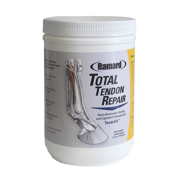 Total Tendon Repair es una fórmula de última generación para tendones y ligamentos que utiliza un ingrediente patentado y clínicamente estudiado para ayudar a respaldar los tendones, los ligamentos y el proceso de curación normal. Total Tendon Repair proporciona a los tendones y ligamentos los ingredientes necesarios para ayudar a mantener sus propiedades biomecánicas y respaldar el proceso natural de regeneración y recuperación del cuerpo. También apoyará un aumento en el colágeno tipo I, que proporciona una mayor resistencia a la tracción y podría ayudar a reducir las recurrencias. Es fundamental abordar los problemas de tendones y ligamentos antes de que se produzcan cicatrices. Las incidencias relacionadas con los tendones son la razón veterinaria más común para el retiro en caballos de carrera y de rendimiento.