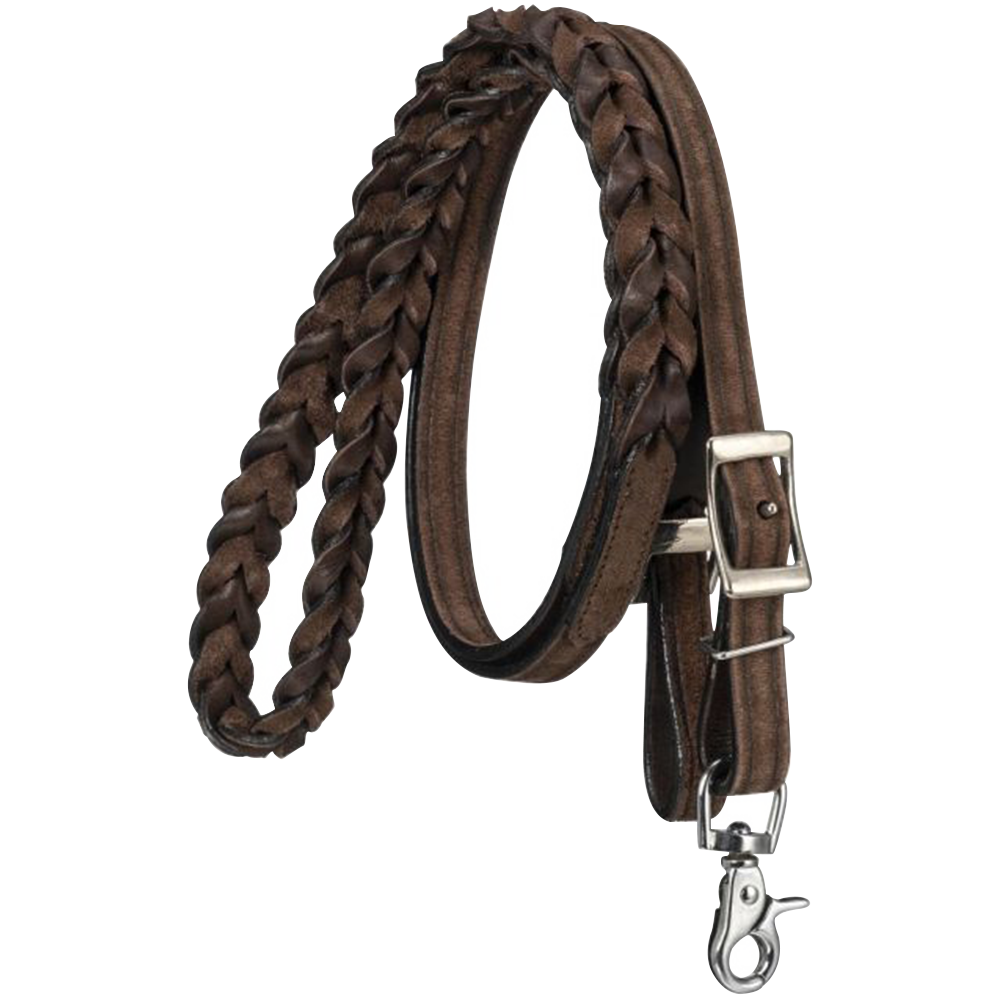 Estas riendas de cuero tienen una divertida sección central trenzada que ayuda a agregar agarre mientras conduces. El ajuste de la hebilla Conway termina con un extremo de tijera en un lado para facilitar el manejo.