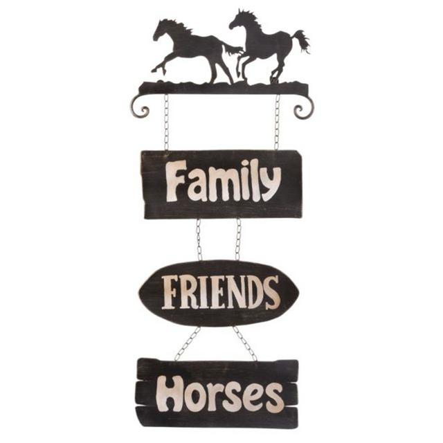 ¡Una gran señal para el granero o la casa! Presenta dos siluetas de caballos al galope con las palabras "Familia, Amigos, Caballos" colgadas en placas debajo. Metal. Ganchos en la parte trasera para colgar en la pared.