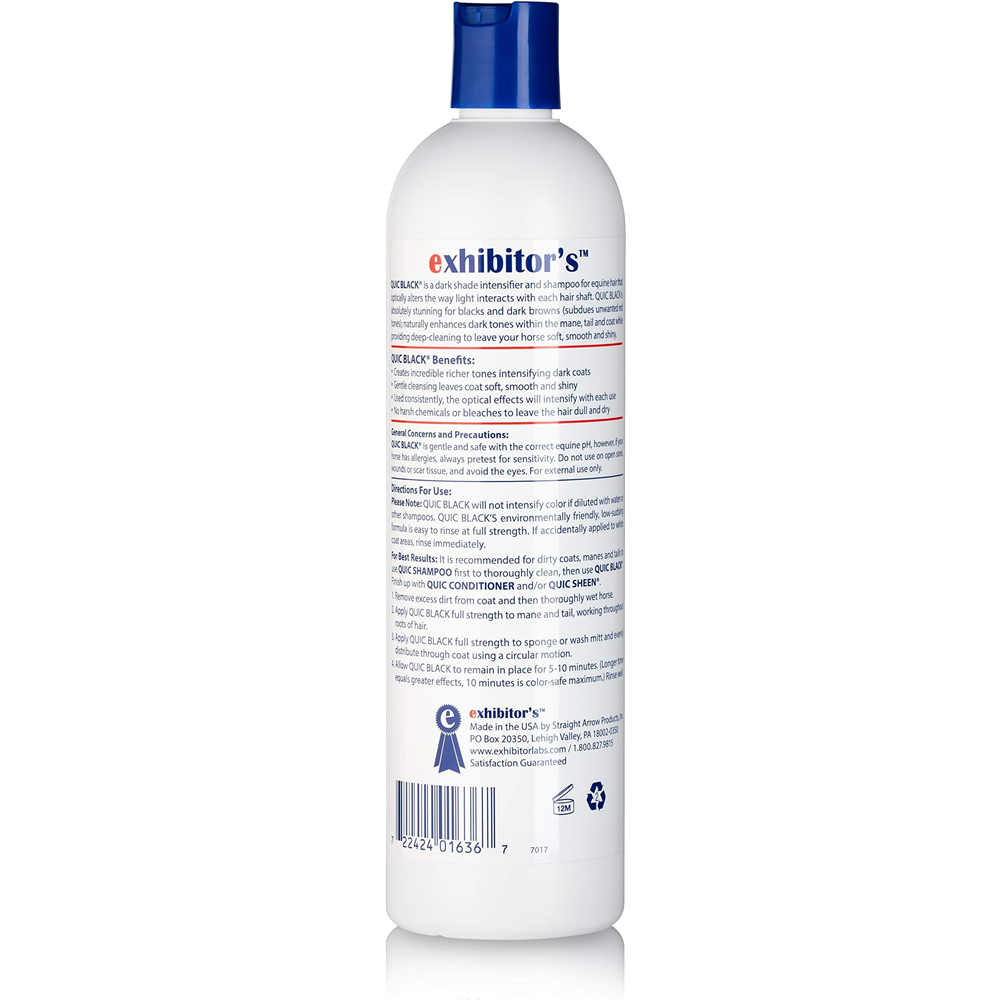 Quic Black® de Exhibitor Labs es un champú profesional diseñado para realzar los tonos negros y cafés oscuros del pelaje, crin y cola de tu caballo. Su fórmula limpia a fondo mientras aporta reflejos azul-zafiro y reduce los matices rojizos causados por el sol.