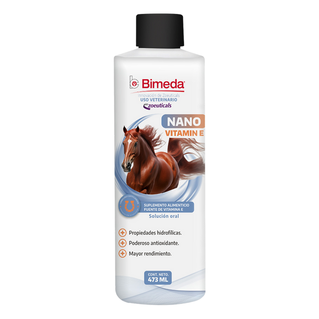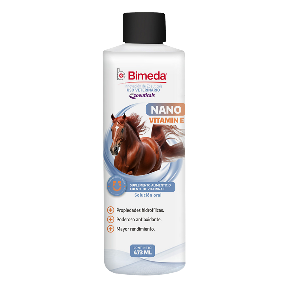 Solución oral de nanopartículas de vitamina E natural, NANO VITAMIN E es una solución oral de nanopartículas hidrosolubles de vitamina E natural. Nano vitamina E está recomendado para caballos de competencia o sujetos a condiciones de estrés.