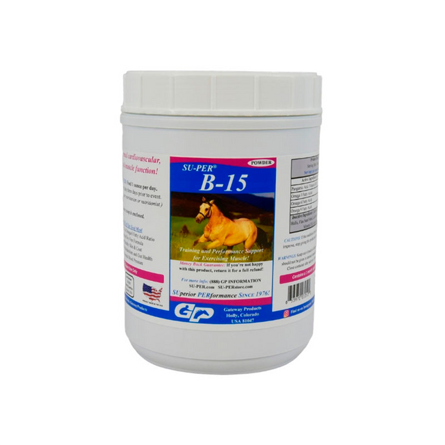 De todos los diversos beneficios de la suplementación con B-15, el que más beneficia a los caballos de rendimiento es su capacidad para proporcionar un impulso de energía. SU-PER B-15 es una forma rápida y fácil de proporcionar un impulso de energía durante la competencia.