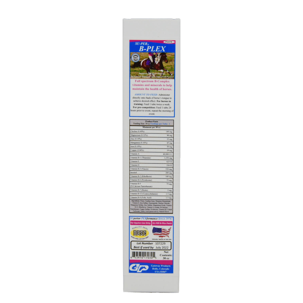 SU-PER®B-Plex es un producto que combina todas las principales vitaminas del complejo B en un solo suplemento. Está diseñado para ayudar a crear más energía, mantener un metabolismo adecuado, ayudar en la digestión y absorción de nutrientes adecuadas y mantener una disposición tranquila en ambientes estresantes. Todos estos beneficios son cruciales para un rendimiento óptimo. SU-PER®B-Plex es la elección de muchos propietarios y entrenadores porque no solo brinda ese pequeño impulso de energía adicional que conduce a la competencia, pero también permite que el caballo mantenga una salud óptima durante una temporada larga y reduce los tiempos de recuperación después de la competencia.