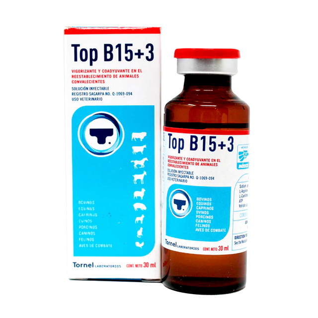 Top B15+3, es una solución vigorizante y coadyuvante recomendada para el restablecimiento de los animales convalecientes que hayan pasado por una intervención quirúrgica, proceso infeccioso o proceso de desnutrición, además de ser recomendado en animales que han sido sometidos a periodos de trabajos forzados, útil en la recuperación en sementales cansados o sobre explotados por tener la propiedad de incrementar la oxigenación y circulación sanguínea, por efecto de la Vitamina B15 (Pangamato de Sodio).