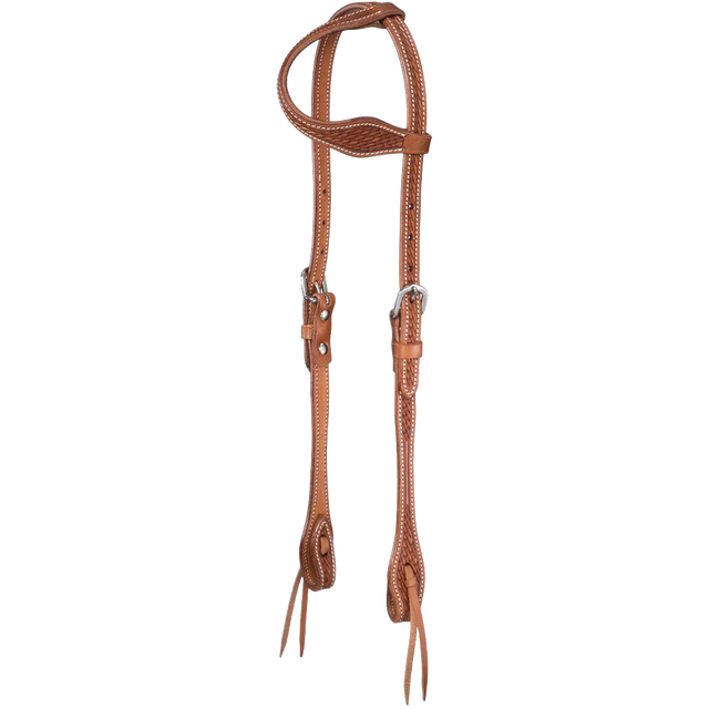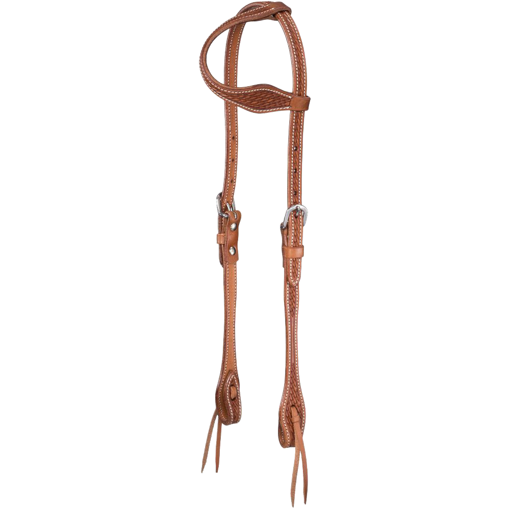 Cabezada elegante y funcional elaborado en cuero premium con estampado “basket stamp” y acabado marron. Se estrecha en el centro y ensancha hacia las mejillas, con extremos tie‑bit para conexión directa al bocado. Perfecto para uso diario o entrenamiento informal con estilo clásico.