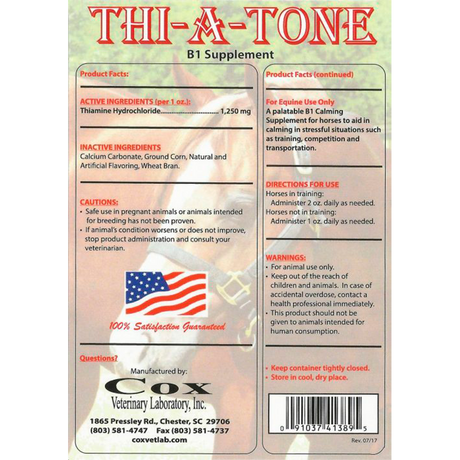 Precio normal $ 1,099.00Precio unitario /AgotadoMuy poca disponibilidad (2 unidades)THI-A-TONE VITAMIN B-1 5 LBS (80 DIAS DE SUPLEMENTO PARA 1 CABALLO)