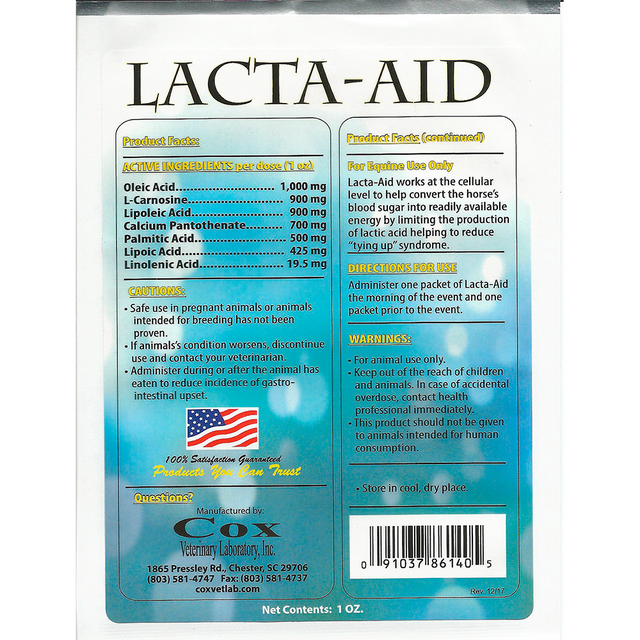 Lacta-Aid actúa a nivel celular para ayudar a convertir el azúcar en la sangre del caballo en energía fácilmente disponible al limitar la producción de ácido láctico, lo que ayuda a reducir el síndrome de "inmovilización"