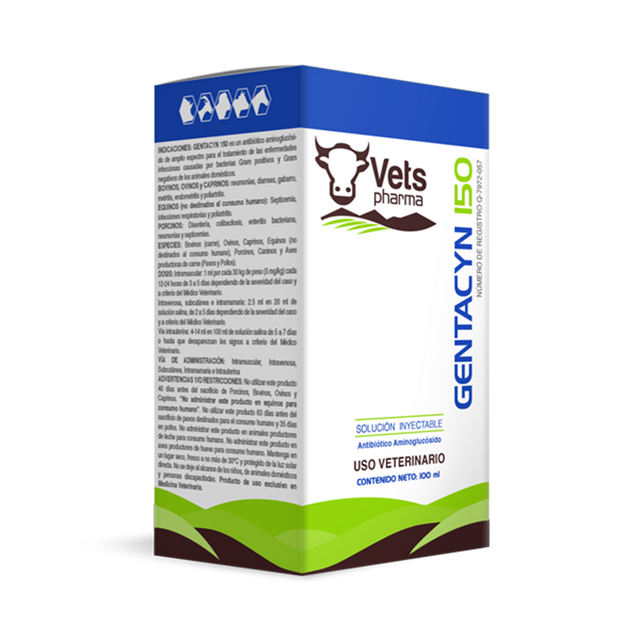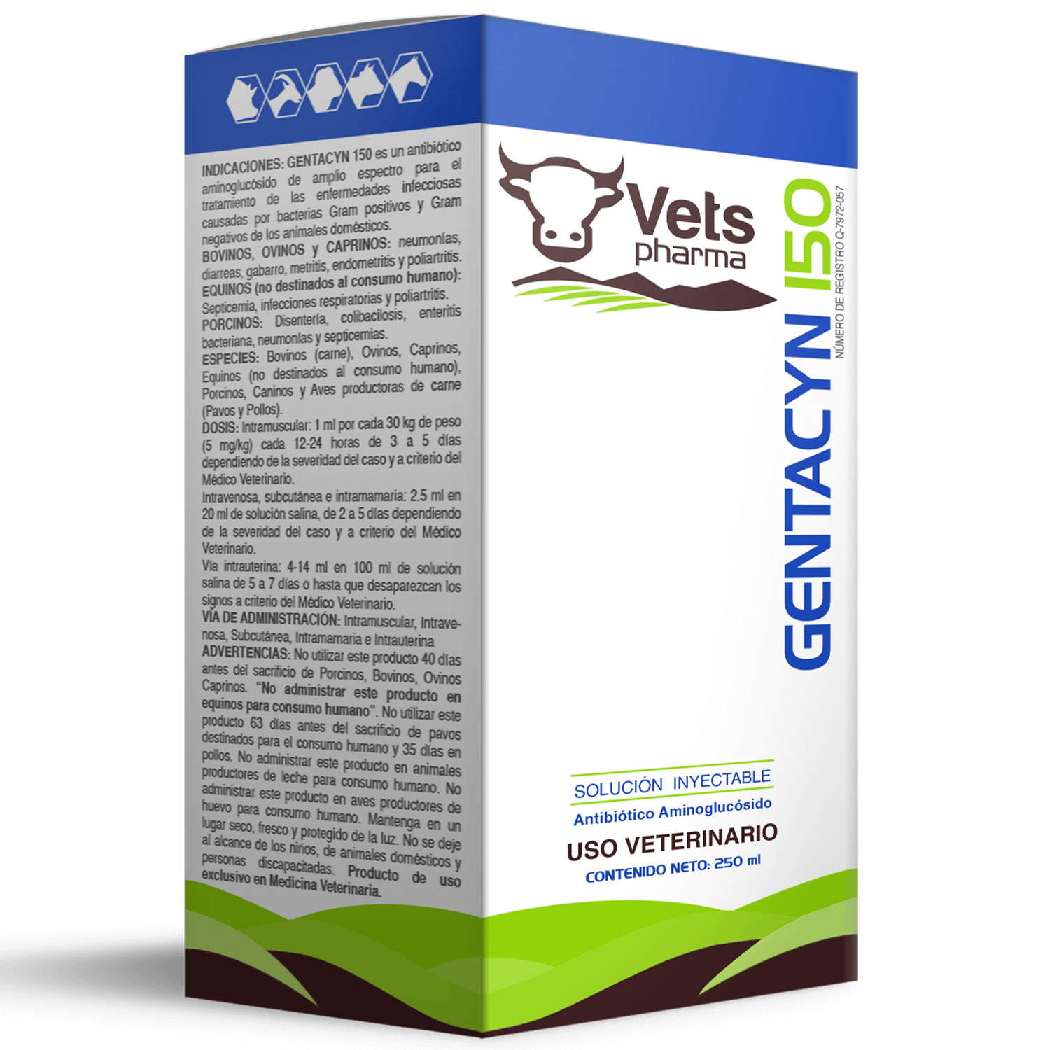 Suspensión inyectable de gentamicina al 15% (150 mg/ml). Bactericida de amplio espectro contra bacterias Gram positivas y Gram negativas, indicada para infecciones sistémicas y respiratorias en animales de producción.