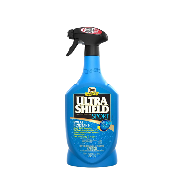 Cuando desee proteger a su caballo en condiciones de calor o humedad, el aerosol para moscas resistente al sudor Ultra Shield® Sport funciona tan duro como usted y su compañero equino. Botella de aerosol de 32 oz y tamaños de galón.