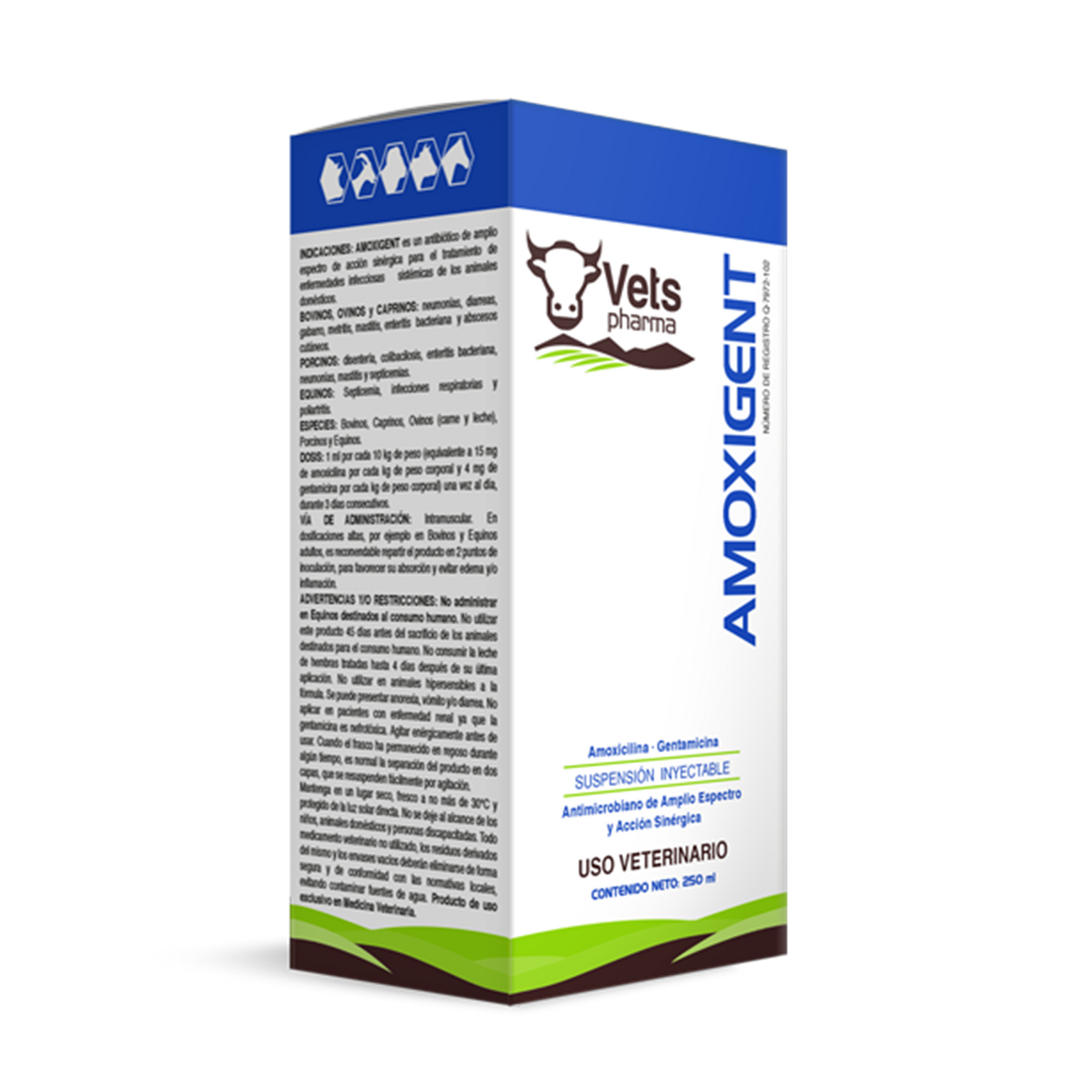 Suspensión inyectable de amplio espectro que combina amoxicilina y gentamicina para una acción bactericida sinérgica en infecciones sistémicas y bacterianas en animales de producción.