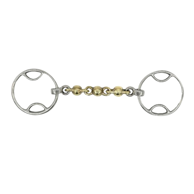 El Brass Waterford Beval Bit combina la embocadura flexible Waterford con el diseño versátil de anillas Beval, proporcionando a los jinetes un mayor control y adaptabilidad. La composición de latón fomenta la salivación, promoviendo una boca más suave y una mejor aceptación del bocado. Este bocado es especialmente eficaz para caballos que tienden a apoyarse o volverse fuertes, ya que la embocadura Waterford desincentiva esta acción, mientras que la configuración Beval permite un ligero efecto de palanca.