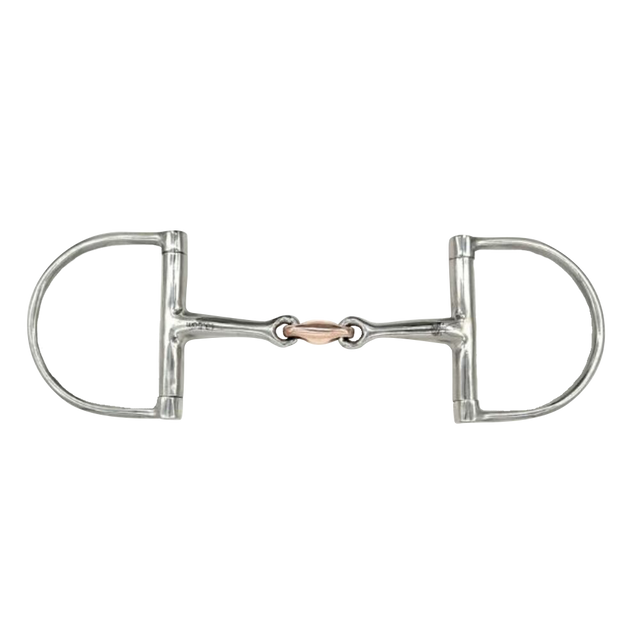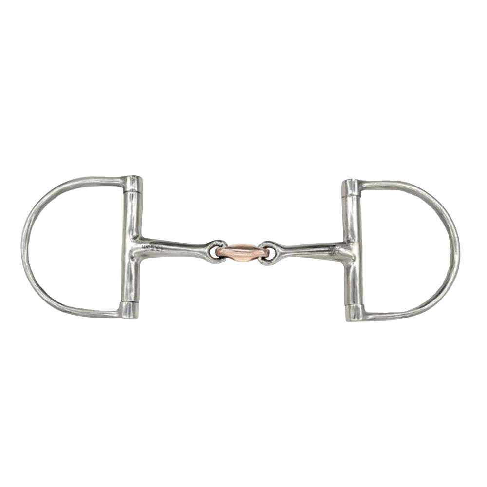 El Double Jointed Copper Elliptical D Bit combina la suave y uniforme presión de una embocadura de doble articulación con la estabilidad lateral de un anillo D fijo. El material de cobre fomenta la salivación, promoviendo una boca más suave y receptiva. Este bocado es ideal para jinetes que buscan una comunicación clara y una conexión estable, lo que lo convierte en una excelente opción tanto para entrenamiento como para uso diario.