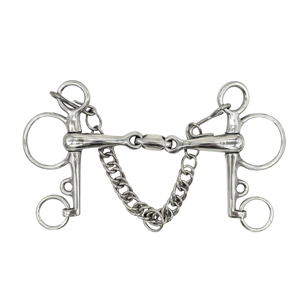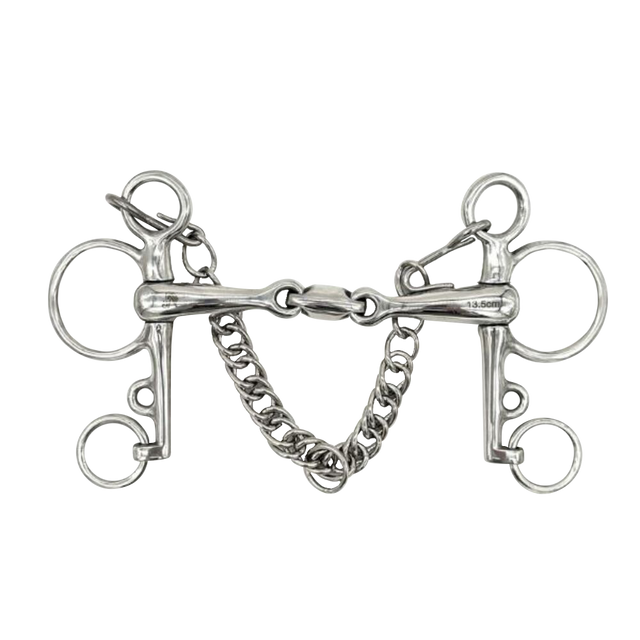 • Opciones versátiles de rienda: El diseño Pelham permite múltiples posiciones para las riendas, ofreciendo flexibilidad en el grado de palanca según la situación de monta.