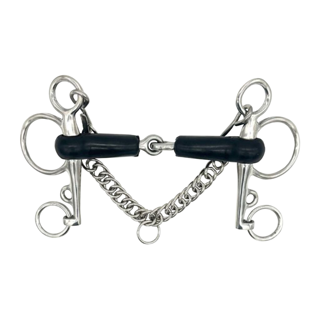 El Single Joint Rubber Pelham Bit combina una embocadura de goma suave con una articulación simple, ofreciendo una presión equilibrada y cómoda para el caballo.