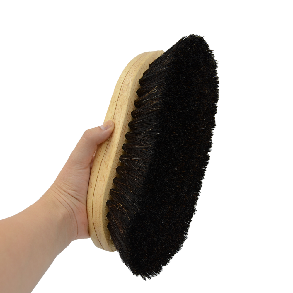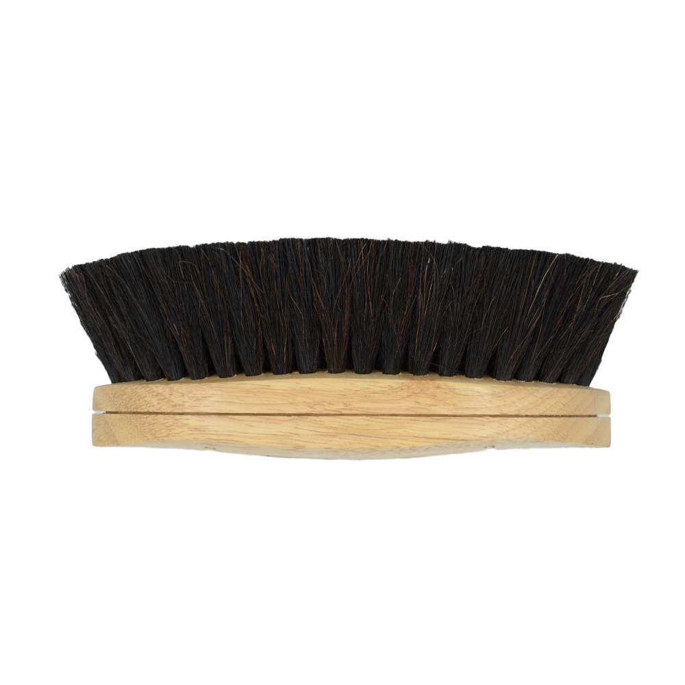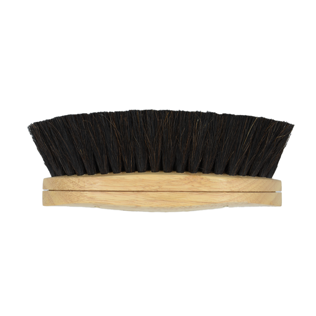 Bloque de cepillo de madera dura con reverso curvado, secado al horno, con doble laca, relleno con una mezcla 70:30 de fibra de polipropileno negra suave y crin de caballo de primera calidad.
